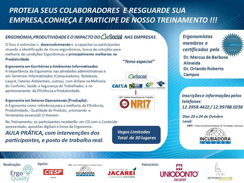 Proteja seus Colaboradores e Resguarde sua Empresa O foco é estimular o desenvolvimento e capacitar os participantes visando a identificação de riscos ergonômicos, busca de soluções e melhoria de condições ergonômicas. Fotos do evento Ant Próximo